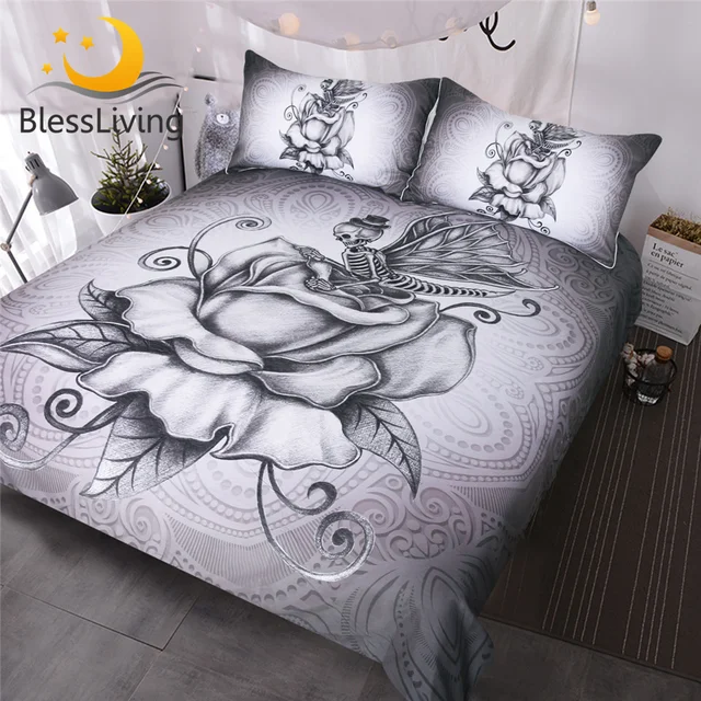 OVERVIEW Product BlessLiving Pale Grey Butterfly Skull Bedding Set 3pcs Retro Roses Duvet Cover Queen Super Soft Bed