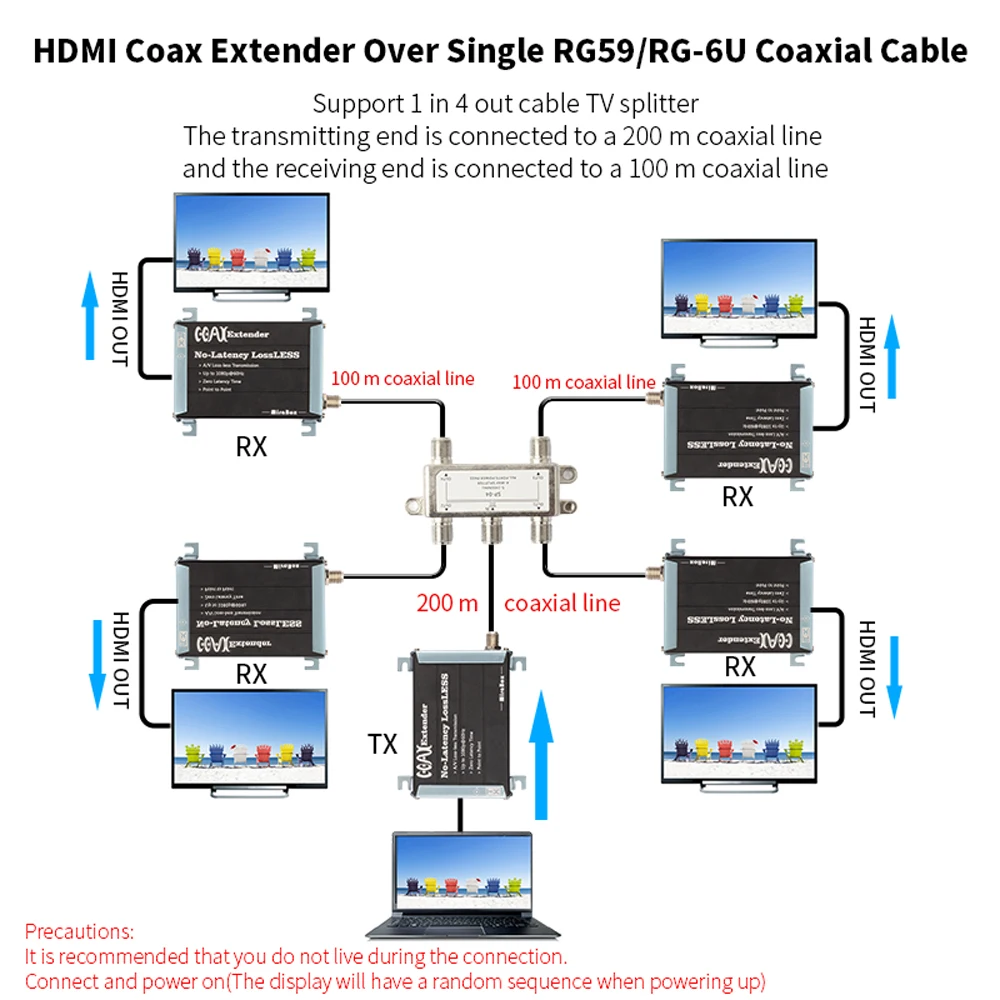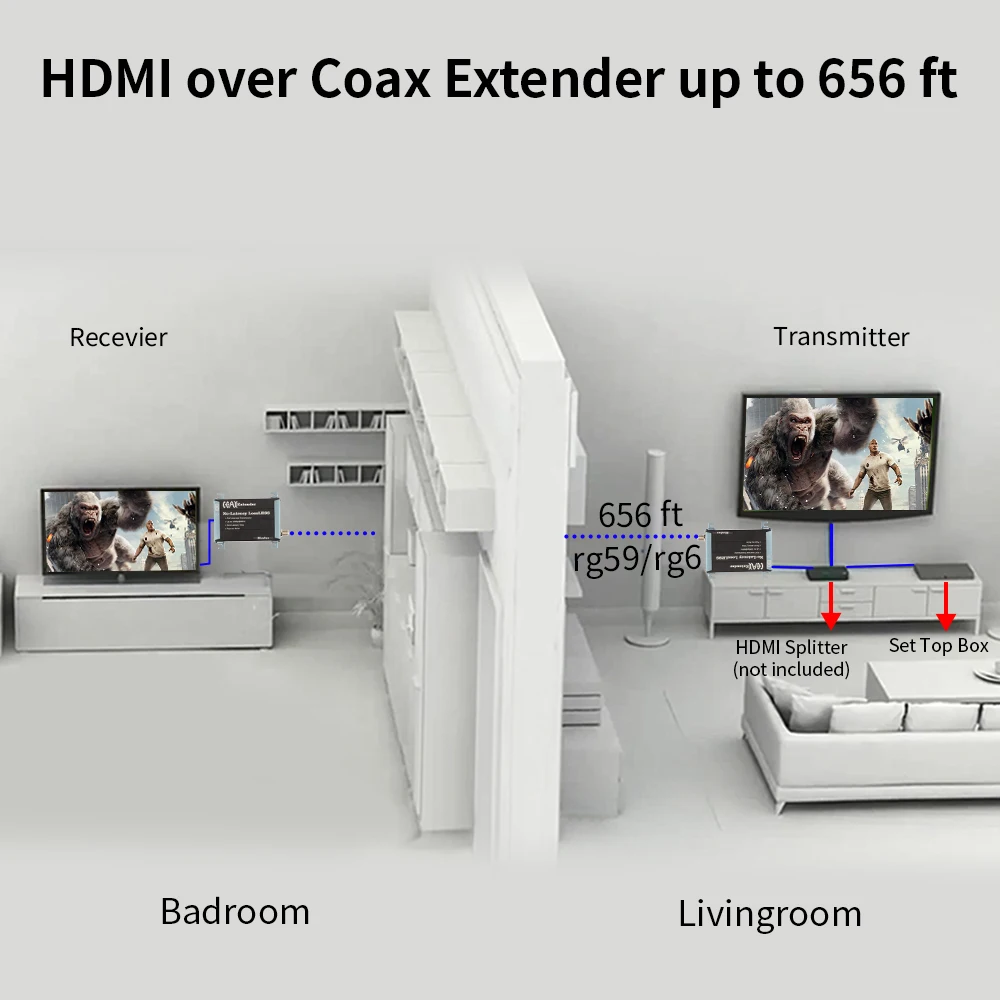HDMI coax Transmitter Over Coax Cable BNC Support A/V Lossless No Latency 1080P upto 200m 400 feet HDMI To Coax Extender : Click Here MiraBox HDMI Extender with IR Remote over ethernet TCP IP by 150m RJ45 Cat5 Cat5e Cat6 HDMI Splitter IR Passback Extender : Click Here HSV701 HDMI Matrix transmitter and receiver 383ft over TCP IP with web UI control, IGMP POE Switch, dip dial extender hdmi : Click Here